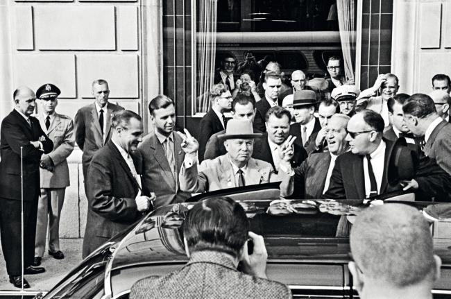 Глава советского правительства, Первый секретарь ЦК КПСС Никита Хрущев у входа в отель Carlton House в Питтсбурге (штат Пенсильвания), где он остановился во время первого в истории советско-американских отношений официального визита в США (15–27 сентября 1959 г.)