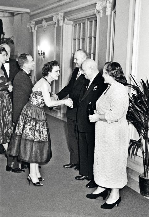 Первый секретарь ЦК КПСС, глава советского правительства Никита Хрущев (в центре справа) приветствует гостей во время торжественного приема в посольстве СССР в Вашингтоне