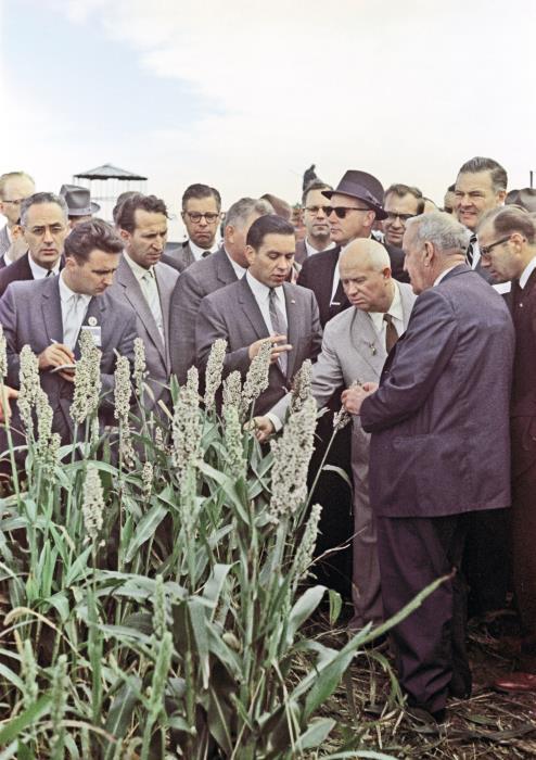 Никита Хрущев (3-й справа) во время посещения сельскохозяйственной фермы Кун-Рапидс американского фермера Росуэлла Гарста (2-й справа), с которым он поддерживал связь с 1955 г. Штат Айова