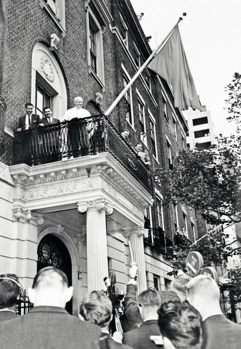 Первый секретарь ЦК КПСС, Председатель Совета Министров СССР Никита Хрущев беседует с журналистами с балкона представительства СССР при ООН в Нью-Йорке