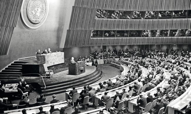 Лидер Союза Советских Социалистических Республик на заседании Генеральной Ассамблеи Организации Объединенных Наций.