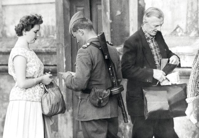 Восточногерманские полицейские проверяют людей, живущих рядом с границей, прежде чем они смогут войти в свои квартиры. 30 августа 1961 г.