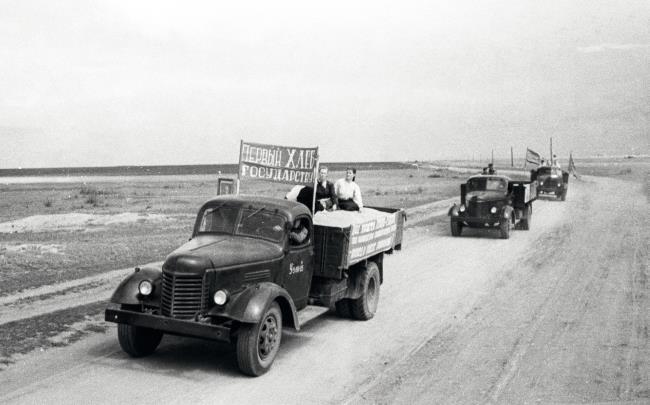 Грузовики с зерном на дорогах целины Алтайского края