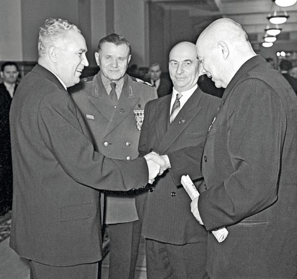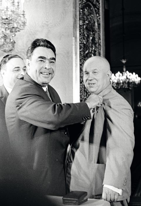 Председатель Президиума Верховного Совета СССР Леонид Брежнев поздравляет Первого секретаря ЦК КПСС Никиту Хрущева с присвоением звания Героя Советского Союза, а также награждает его орденом Ленина и медалью «Золотая Звезда» за выдающиеся заслуги перед Коммунистической партией и Советским государством