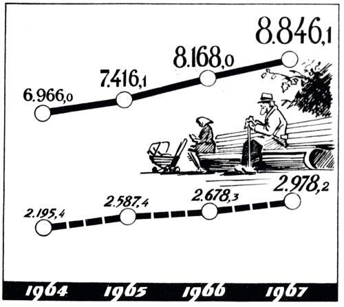 Рост государственных отчислений на пособия и пенсии в СССР (в миллионах рублей). Репродукция плаката