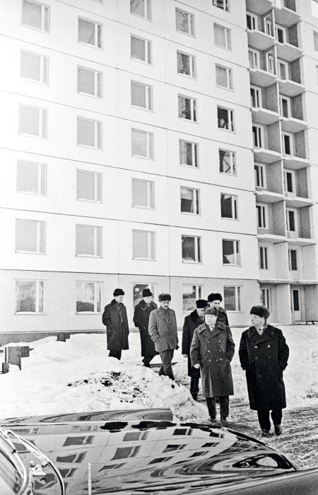 Депутаты Моссовета во время осмотра нового жилого дома, построенного методом панельного домостроения
