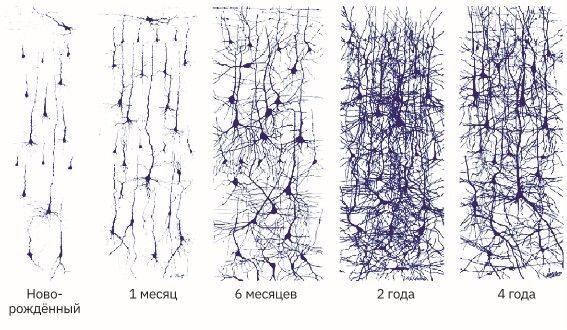 Первые пять лет жизни наш мозг в буквальном смысле переживает бум синаптического роста: молоденькие нейроны мозга хаотично связываются друг с другом мириадами связей – сцепляются, словно лианы в самых густых джунглях. Это обеспечивает быстрый процесс научения, но, как показывают исследования французского нейробиолога из Коллеж де Франс Станисласа Деана, существенно увеличивает время обработки информации. Так, префронтальная кора младенца реагирует на существенные изменения в стимульном материале до четырёх раз медленнее, чем кора взрослого.