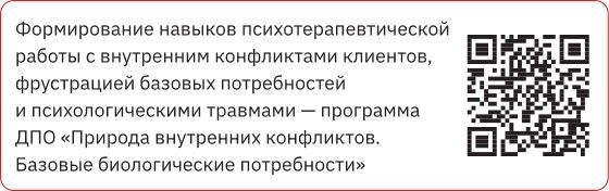 Наконец, мы завершаем нашу работу этапом интеграции и принятия, где клиент учится принимать себя, свои слабости и внутренние противоречия. Именно в этот момент возникает понимание, что мы можем продолжать развиваться, не вступая в вой ну с самим собой, а, напротив, лишь принимая во внимание всё, что делает нас теми, кто мы есть.