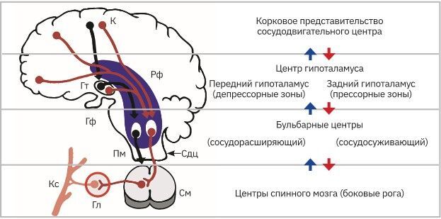 Рис. 77. Сосудодвигательный центр и его проекции