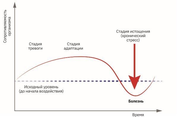 Это самая опасная фаза стрессовой ситуации является следствием невосполнимой растраты энергии на двух предыдущих стадиях. Чрезмерные или длительные стрессовые перегрузки, таким образом, крайне опасны, поскольку могут закончится самыми разными заболеваниями нашего организма и психики («болезням стресса») – депрессиям и неврозам, гипертонии и диабету, инфаркту миокарда, инсульту, нарушениям иммунной системы.
