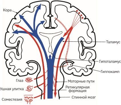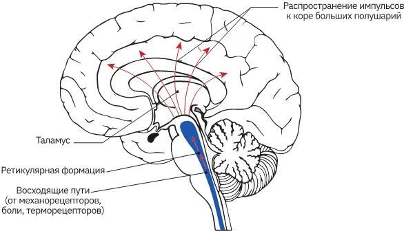 Во-первых, дорсальный путь через таламус. Это нервные пути, которые были открыты ещё Дж. Моруцци и Г. Мэгуном. Он обеспечивает широкое распространение активирующих влияний по коре через таламо-кортикальные связи, что важно с точки зрения регуляции циклов «сон – бодрствование», поддержания активного уровня сознания, концентрации внимания.