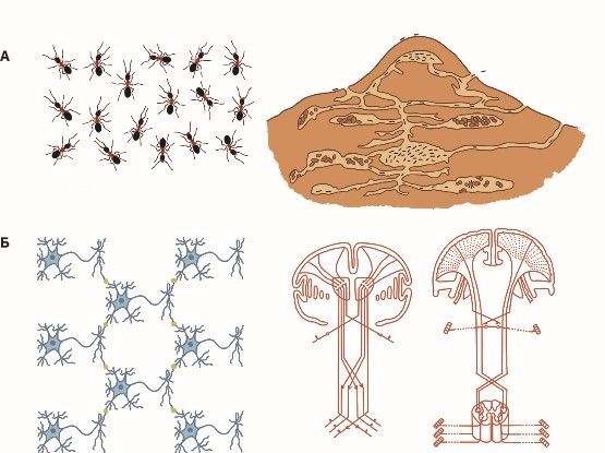 Рис. 8. Устройство муравейника (А) и проводящих путей центральной нервной системы (Б)