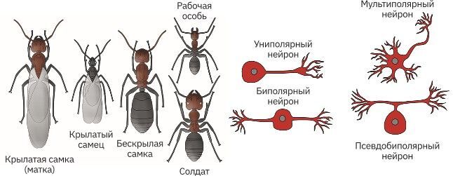 Рис. 9. Морфологические различия между муравьями и нейронами в зависимости от их роли и функции
