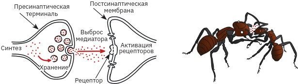 Рис. 11. Химическая передача в синапсе и при взаимодействии между муравьями