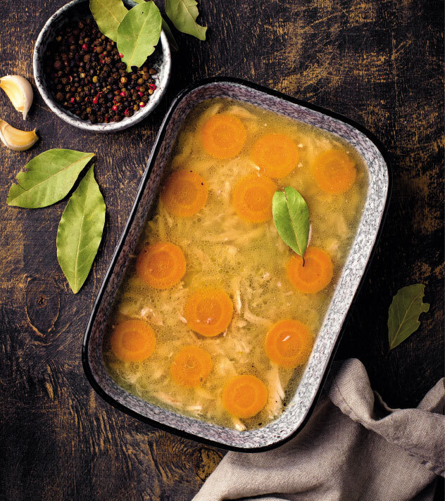 4. Процедить бульон и залить им мясо. Остудить до комнатной температуры, затем убрать в холодильник до полного застывания.