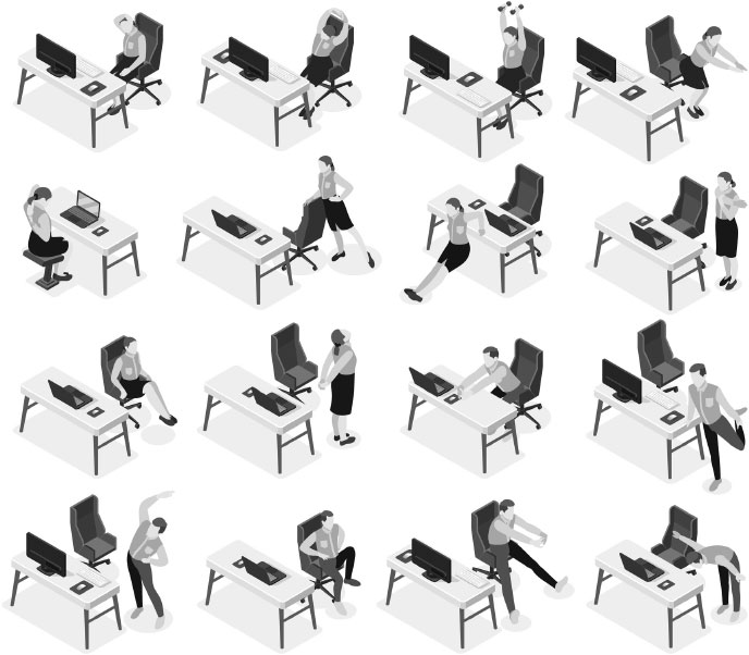 • Обращайте внимание на монотонную работу, при которой происходят одни и те же движения или практически нет движения, и сбалансируйте ее. Во время работы за компьютером делайте перерывы, чтобы встряхнуться и порастягиваться.