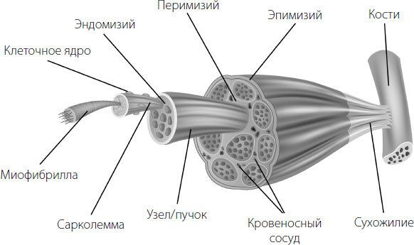 Один мясистый отрезок мышцы окружен так называемыми фасциями, известными также под названием «соединительная ткань». Они отвечают за то, чтобы разделять мышцы на сегменты, придавать им форму и обеспечивать поверхность, вокруг которой двигаются окружающие ткани, не нанося вреда. Соединительная ткань, которую окружает один пучок мышечных волокон, называется перимизий, а та, что держит мышечные волокна вместе, – эпимизий. Особенно чувствительные и тонкие фасции, окружающие отдельные мышцы, известны под названием эндомизий.