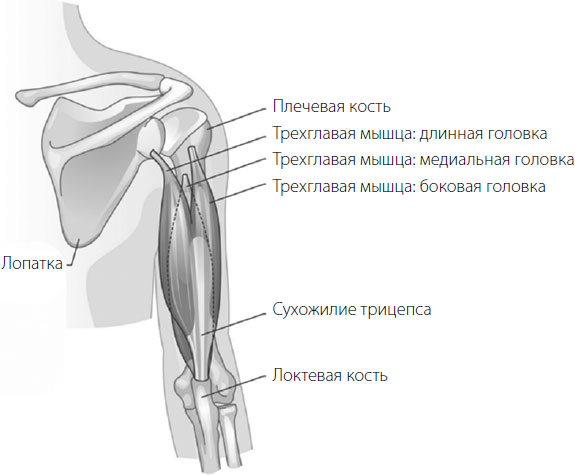 Трехглавая мышца (трицепс) является единственной мышцей в области тыльной стороны руки и имеет три мышечные головки. Она соединяется с лопаткой, а также с костями плеча и локтя.