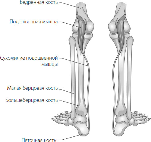 Подошвенная мышца находится в подколенной ямке и связана с длинным сухожилием, проходящим по всей голени до стопы, и пяточной костью.