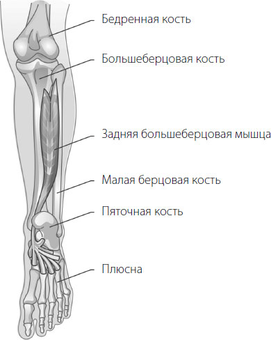 Задняя большеберцовая мышца находится между голенью и малой берцовой костью. Она крепится к голени и через связку соединяется с плюсной.