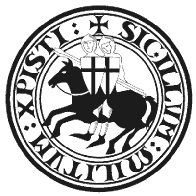 Современная прорисовка печати тамплиеров. На ней изображены два рыцаря, сидящих на одном коне: символ бедности и братской взаимовыручки