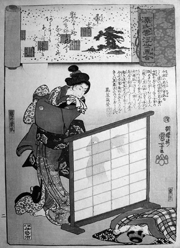 Утагава Куниёси. Тень. 1880-е гг. Женщина-кицунэ отбрасывает на ширму тень в виде лисы