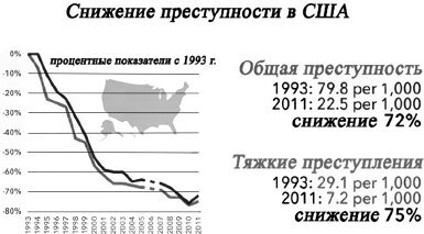 Действительно, обвал насилия в мире на последнем этапе истории был столь резким, буквально за одно-два поколения, что криминологи в США тоже ерошили свои чубы в полнейшем недоумении: а что вообще происходит? Раньше, в связи с притоком мигрантов, насильственная преступность в стране росла и, делая свои обычные примитивные экстраполяции, свойственные науке, криминологи предрекали в будущем полный хаос. А кинематографисты на фоне таких прогнозов любили снимать апокалиптические фильмы о той криминальной жути, которая нас всех ждет в будущем. Действительность, однако, посрамила всех – совершенно неожиданно, что называется, без объявления войны, преступность в девяностых годах вдруг начала валиться вниз ошеломляющими темпами.