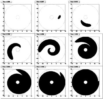 Численная модель распространения волны панспермии в Галактике. Время на рисунках указано в галактических годах, расстояние по осям координат в килопарсеках. Считается, что область галактического ядра непригодна для предбиологической эволюции, расчет проведен для звезды – источника инфекции, находящейся на таком же расстоянии от центра Галактики, как Солнце.