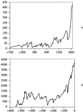 На одной из научных конференции по Универсальной истории, которую организовал А. Назаретян, встретились два докладчика – уже знакомый нам палеонтолог Марков, а фамилию второго я подзабыл. Кажется, это был Андрей Коротаев, известный исследователь мир-системных процессов. Первый продемонстрировал график роста морской биоты в фанерозое, второй – динамику роста народонаселения в историческом Китае. Графики были довольно похожими, и оба исследователя, развеселившись, даже решили написать по этому поводу совместную работу. И написали, а кто запретит?