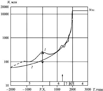 Ниже показан график роста населения, взятый из одной книг Капицы. Цифрой 1 обозначена реальная численность населения, цифрой 2 – теоретическая кривая, описываемая формулой гиперболического роста. Стрелочка внизу показывает нам на небольшой чумной провал численности. Обратите внимание, что после этого провала население опять-таки росло ускоренно, словно стараясь как можно быстрее и лучше лечь обратно на теоретическую кривую.