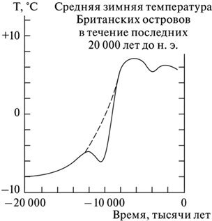 Еще один любопытный график. Это выход из ледниковья. Провал температуры в районе «–10000» вызван крупным извержением, если мне память не изменяет, но причины падения нам сейчас не важны. Нам важно, что после провала температура не поползла снова вверх со скоростью тренда (показан пунктиром) параллельно пунктиру, а просто догнала его. Вот это я и называю несущей способностью кривой. О чем это говорит? О фундаментальности процесса. На который если что-то случайное и влияет, то великая неслучайная несущая сила эти флуктуации потом исправляет.