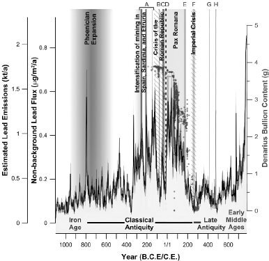 Металлургия древности, добывая сотни тысяч тонн свинца, неизбежно выбрасывала свинцовую пыль в атмосферу. Кроме того, при добыче серебра из свинцово-цинковых руд в атмосферу также выбрасывались его соединения, а серебра для денежного оборота десяткам миллионов людей требовалось много. Эти свинцовые пары атмосферными потоками разносились по всему северному полушарию и медленно оседали везде. И в Гренландии тоже, где их консервировал лед. Интересно, что слои свинца четко коррелируют с хозяйственной деятельностью – концентрация свинца меньше в тех слоях льда, которые хронологически соответствуют временам упадка и чумы.