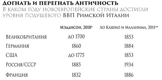 Известный британский экономист Энгас Мэддисон, много лет посвятивший изучению экономики древности, а также Элио Ло Кашио и Паоло Маланима приводят нижеследующие данные по мощности античной экономики, из которых следует удивительный вывод: СССР, например, по уровню подушевого ВВП догнал Древний Рим эпохи расцвета только в 1934 году.