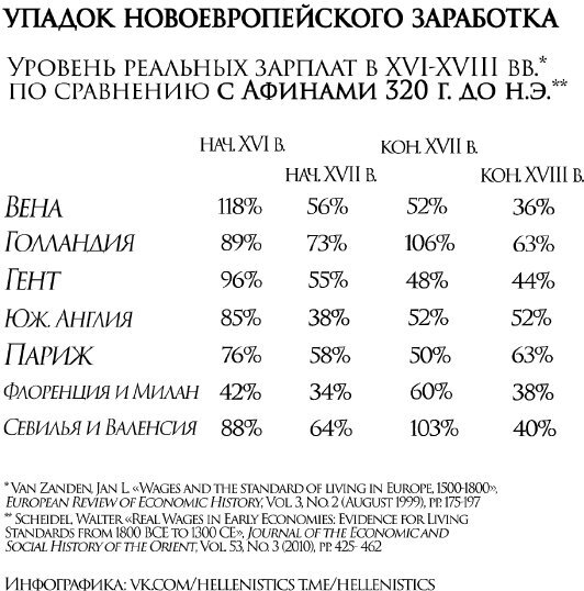 Но античность – это не только Рим, но и Древняя Греция. И вот вам соотношение реальных зарплат в великолепной Элладе и постсредневековой Европе, то есть Европе, вылезшей наконец из темных веков.