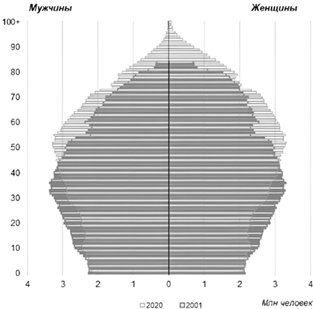 Тут же для сравнения показана половозрастная пирамида ЕС (усредненная по странам).