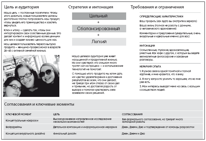 В кратком описании вы записываете свои мысли об оптимальном дизайне продукта и выдвигаете гипотезы о том, как лучше всего воплотить его в жизнь. Подобно краткому описанию проекта, это описание предназначено для четкого резюме, в каком направлении вы планируете двигаться (рис. 7.2). Однако оно чуть больше сосредоточено на особенностях дизайна. В нем формулируется представление о восприятии пользователя и то, как это представление будет воплощено в жизнь. Краткое описание дизайна вы создаете для своей команды, для всех заинтересованных сторон, которые должны утвердить направление дизайна, и для себя. Если краткое описание проекта помогает вам сформировать общее представление о целях проекта, то краткое описание дизайна помогает получить общее представление об индивидуальности и сути UX-дизайна.