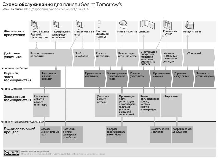 Рис. 7.22. На этой схеме, разработанной Брэндоном Шауэром из Adaptive Path, описаны этапы, через которые проходит пользователь, ключевые точки взаимодействия и вспомогательные процессы, которые происходят «за кулисами»