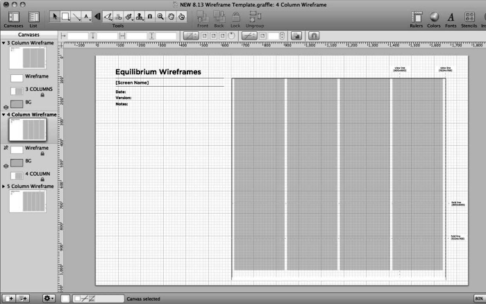 Рис. 7.24. Шаблон вайрфрейма, созданный в OmniGraffle. В левой части шаблона предусмотрено место для аннотаций. Справа – место для вайрфрейма. Серые прямоугольники представляют собой сетку из четырех столбцов