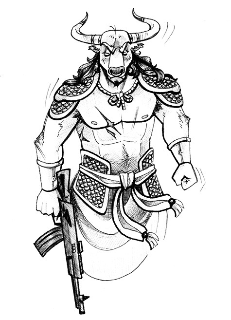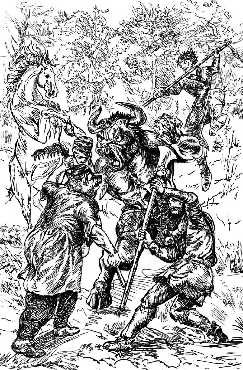 Посох, грабли и лопата обрушились с трех сторон. Пока демон-бык соображал, что тут происходит, в тыл ему тихонько зашел белый конь, добавив убийственных пинков обоими задними копытами. А дальше, по выражению Аверченко, — все завертелось и закружилось…