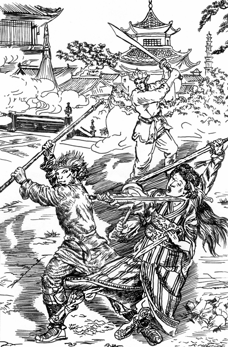 — Бесстыжая дрянь, тебе ли говорить о воспитании, — не прекращая сражения, вежливо отвечал Мудрец, равный Небу. — Я родился из камня, не зная ни отца, ни матери. Но даже мне известно, что никому не позволено безнаказанно обижать святого человека, похищать его, избивать и жрать вареным или жареным!