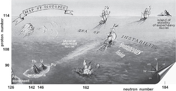 Вдохновившись собственной метафорой и ощутив себя отважными мореплавателями, ученые принялись готовиться к завоеванию этого острова. Они обсуждали поиски «Атлантиды химических элементов», а некоторые, подобно старинным мореходам, даже вычерчивали в сепии карты неизведанных ядерных морей. Казалось, никто бы не удивился, если бы эти моря кишели спрутами. Попытки достичь этого острова сверхтяжелых элементов породили одну из самых захватывающих физических дисциплин. Ученые пока не добрались до этих берегов (чтобы получить по-настоящему стабильные «дважды магические» элементы, требуется искать способы внедрения все новых нейтронов в элементы-мишени), но уже прочесывают отмели, отыскивая удобную бухту, чтобы высадиться на берег.