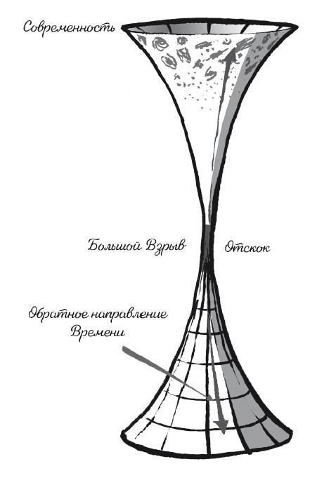 Однако когда Хокинг с коллегами решили свои уравнения и выполнили приблизительные вычисления на компьютере, они столкнулись с сюрпризом: направление времени в предшествующей Вселенной оказалось противоположным направлению времени в нашей Вселенной. Поэтому события на одной стороне не окажут никакого влияния на другую. Это как песочные часы, бегущие в обоих направлениях одновременно.