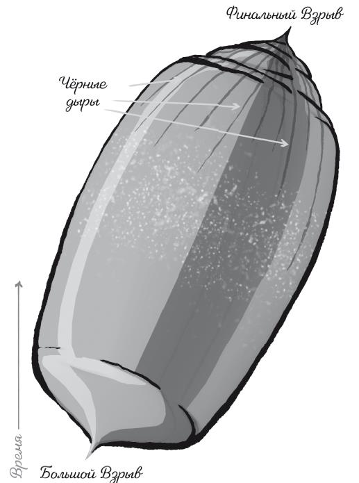 Поэтому гипотетически астрономы будущего будут наблюдать, как галактики становятся все ближе и ближе друг к другу, а температура космоса повышается. Однако черные дыры будут продолжать поглощать материю и постоянно расти, пока не сольются в конечной стадии существования Вселенной и не займут все больше и больше пространства. Поэтому финальный взрыв не будет зеркальным отражением Большого взрыва, он будет крайне неоднородным: пространство-время будет полностью смято черными дырами и другими гравитационными эффектами. (Если плотность материи во Вселенной будет настолько высока, что произойдет окончательный взрыв, это должно произойти через время от нескольких десятков до 100 миллиардов лет задолго до того, как черные дыры испарятся.) Энтропия также будет расти до самого конца, поскольку большая ее часть содержится в черных дырах.