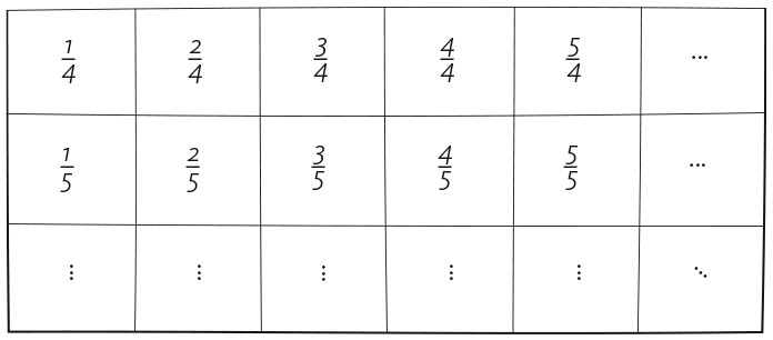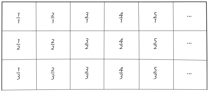 Если продолжить эту таблицу во всех направлениях, она будет включать все рациональные числа. Конечно, в ней окажется много повторов, но мы с этим справимся. Вопрос в том, можем ли мы взаимно однозначно сопоставить все различные числа в этой таблице со множеством целых чисел? Для начала вы можете попробовать сделать это для одной строки, сопоставляя последовательно дроби и целые числа. Например, если вы возьмете вторую строку, то напишете следующее: