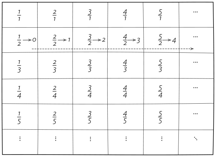Это действительно удивительно умная идея. Стратегия Кантора никогда не подведет, и по мере движения по таблице каждая дробь сопоставляется с каким-то натуральным числом. Итак, доказано, что мощность рациональных чисел равна