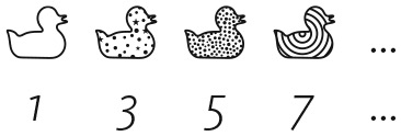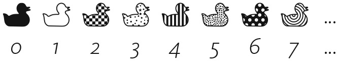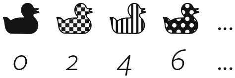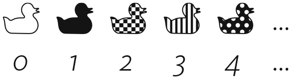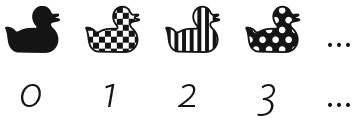 Черная уточка финиширует первой и немного раздражена тем, что ее наградили нулем. Впрочем, ноль — первое из натуральных чисел, так что особо жаловаться ей не стоит. Клетчатая уточка заканчивает гонку второй и получает второе натуральное число (1), полосатая занимает третье место и получает третье натуральное число (2) и т. д. Многоточия указывают на то, что в гонке участвует бесконечное количество уток и каждой из них присваивают какое-то натуральное число. Теперь предположим, что проводится другая гонка, в которой на одного участника больше: добавляется белая утка. Она довольно медлительна и пересекает финишную черту, когда все остальные уже закончили гонку. Картина выглядит примерно так: