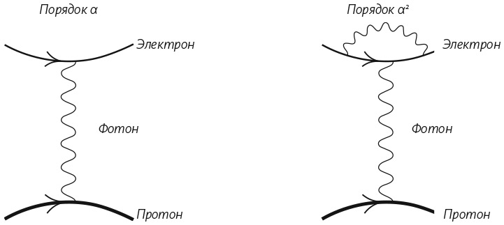 Протон в атоме водорода взаимодействует со своим электроном. Левый рисунок показывает физические эффекты порядка α, соответствующие обмену виртуальным фотоном. На правом рисунке показана корректировка порядка α2, когда электрон испускает и сразу поглощает еще один виртуальный фотон