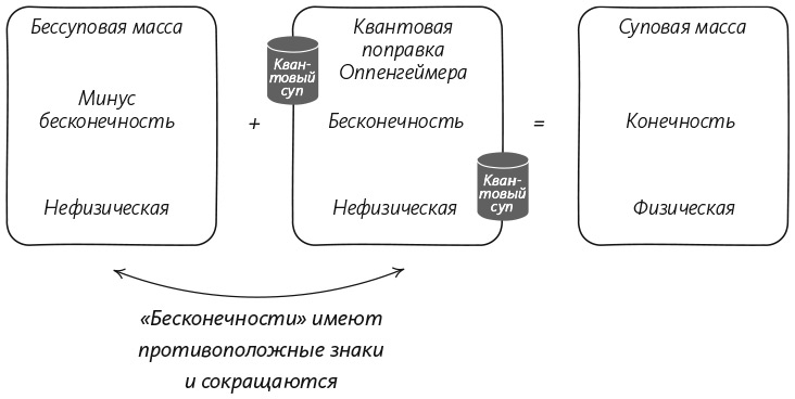 Оппенгеймер не понял, что, хотя его расчеты включали две разные массы — суповую и бессуповую, — только одна из них имела физический смысл. Дело в том, что вы можете измерить только суповую массу, поскольку электрон никогда не сможет выбраться из этого квантового супа. Оппенгеймер считал: чтобы теория имела смысл, обе массы должны быть конечными. Но это не так: конечной должна быть только физическая, суповая масса. Нефизическую, бессуповую в принципе нельзя измерить, так что она вполне может быть бесконечной. На деле оказывается, что она и должна быть бесконечной, — по крайней мере, такой же бесконечной, как бесконечная квантовая поправка Оппенгеймера, но с противоположным знаком.
