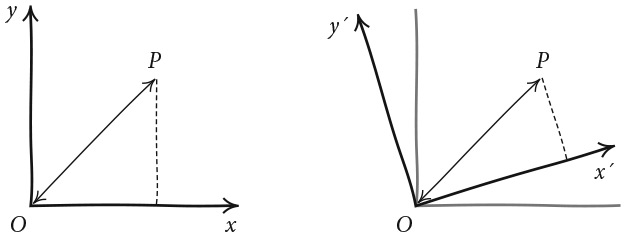 O, как показано на правом рисунке, и определим новый набор координат (