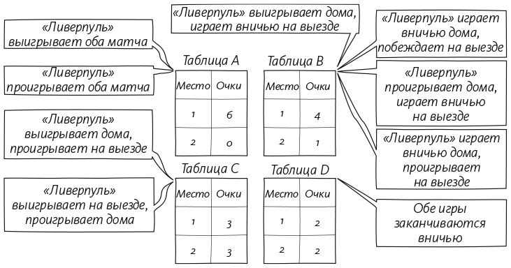Математика Премьер-лиги с двадцатью командами слишком сложна, чтобы разобраться в ней во всех подробностях, поэтому сократим число команд и представим урезанную лигу, в которой всего два соперника: «Ливерпуль» и «Манчестер Юнайтед». Ради математической простоты мы уберем все остальные команды, включая «Эвертон», «Арсенал», «Тоттенхэм Хотспур» и даже живущий на нефтяные деньги «Манчестер Сити». В сезоне такой ужатой Премьер-лиги состоятся всего две игры, а значит, возможны всего девять разных исходов. Если нас не беспокоит вопрос, кто на первом месте, а кто на втором, разные результаты матчей могут привести к одинаковой турнирной таблице. Поскольку за победу начисляется три очка, за ничью — одно, а за поражение — ноль, девять возможных исходов дадут четыре разные турнирные таблицы, как показано на следующем рисунке.